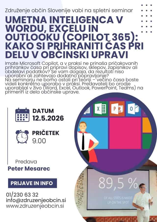 Na seminarju ne bomo ostali pri teoriji – večino časa boste videli konkretno uporabo v praksi. Predavatelj bo orodje uporabljal v živo (Word, Excel, Outlook, PowerPoint, Teams) na primerih iz dela občinske uprave.
